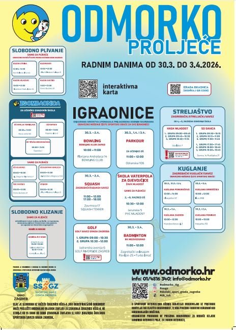 Vijesti Odmorko – proljeće 2026. Školski sportski savez Grada Zagreba tijekom proljetnoga odmora učenika od...Pročitajte više ...
