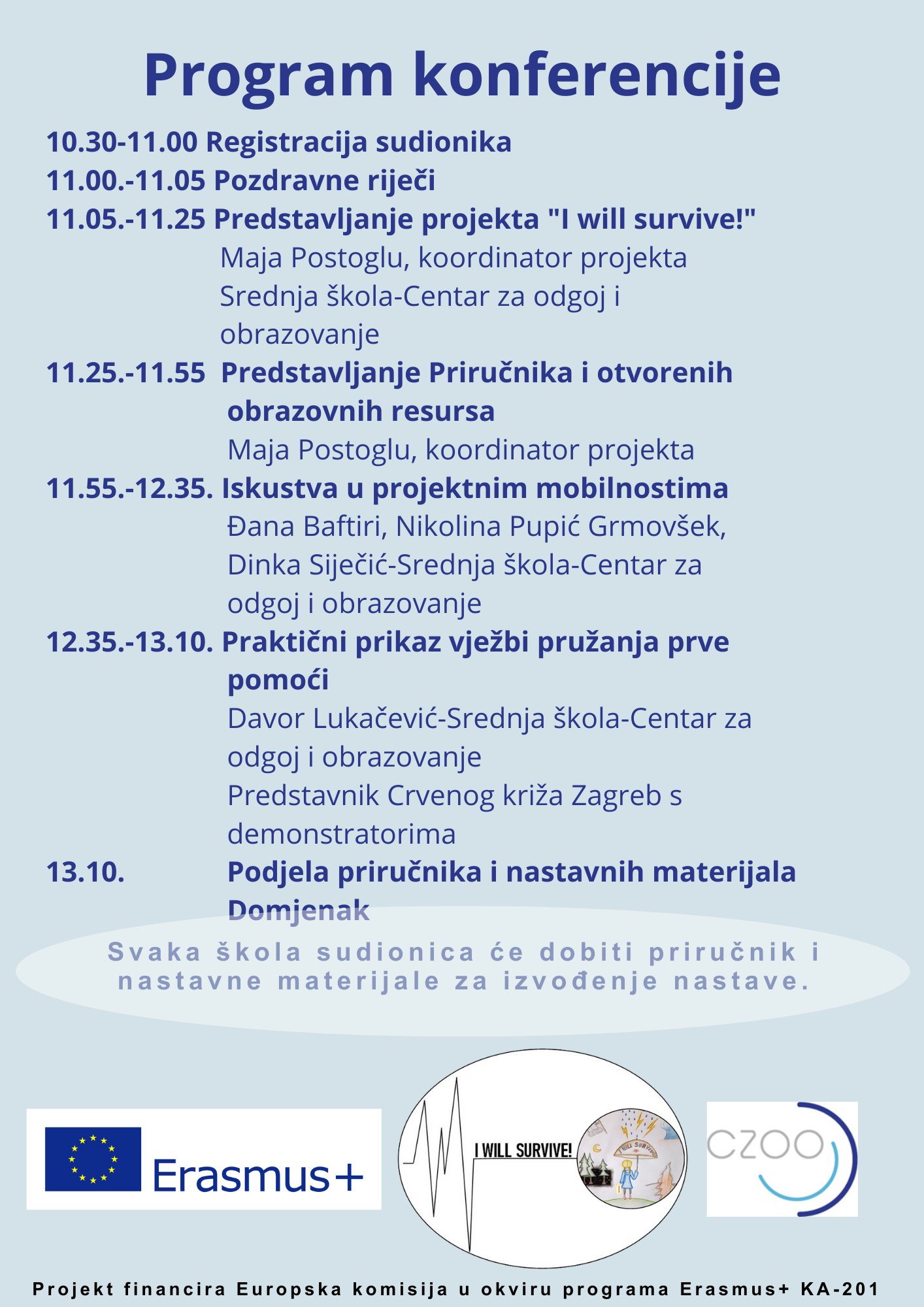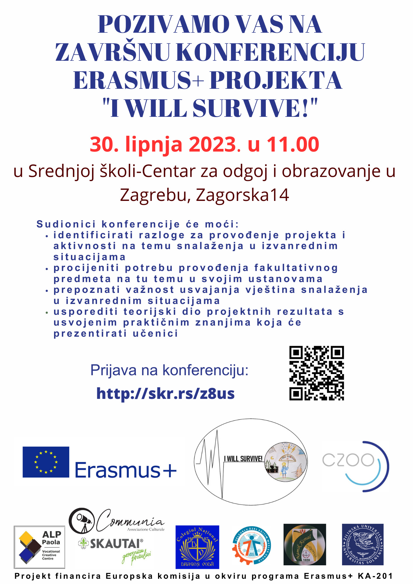 Pozivamo vas na završnu konferenciju Erasmus+ projekta „I will survive“ koja će se održati 30.6.2023. u 11 sati u našoj školi. Na konferenciji će biti predstavljen projekt i priručnik koji je proizašao iz porojekta, podijelit ćemo iskustva s mobilnosti, održat će se prikaz praktičnih vježbi pružanja prve pomoći i domjenak. Svi sudionici će dobiti priručnik i nastavne materijale. Prijaviti se možete putem ovog linka http://skr.rs/z8us . Prijave su još uvijek otvorene!