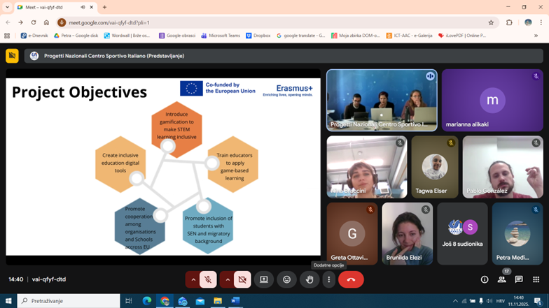 U utorak, 11. studenoga 2025., održan je prvi online sastanak partnera na novom Erasmus+ projektu The Game Operator, usmjerenom na primjenu gamifikacije u inkluzivnom obrazovanju. Projekt traje 24 mjeseca i okuplja organizacije i škole iz Italije, Hrvatske, Španjolske i Grčke.