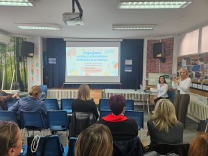 Profesorica Ivana Bilić i pedagoginja Tamara Štimac održale su predavanje „Uloga glazbe u radu s učenicima s teškoćama u razvoju“ te nam predstavile priručnik na kojem su radile u sklopu Erasmus+ projekta. U priručniku su razrađene glazbene aktivnosti za poticanje kognitivnih i socijalnih vještina učenika s poremećajem iz spektra autizma, koje će nam sigurno koristiti u radu.